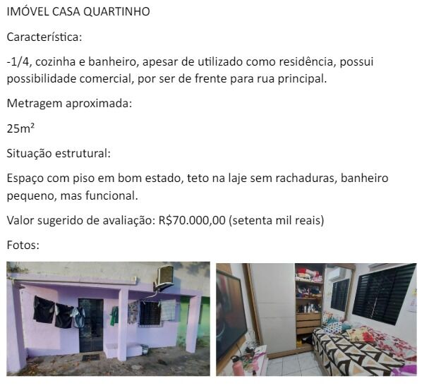 Característica: -1/4, 1 Banheiro, Sala de estar, Sala de jantar e Cozinha integradas. Metragem aproximada: -20m² Situação estrutural: -Casa antiga, sem pintura, pequena, precisando de reforma, como todas as demais.